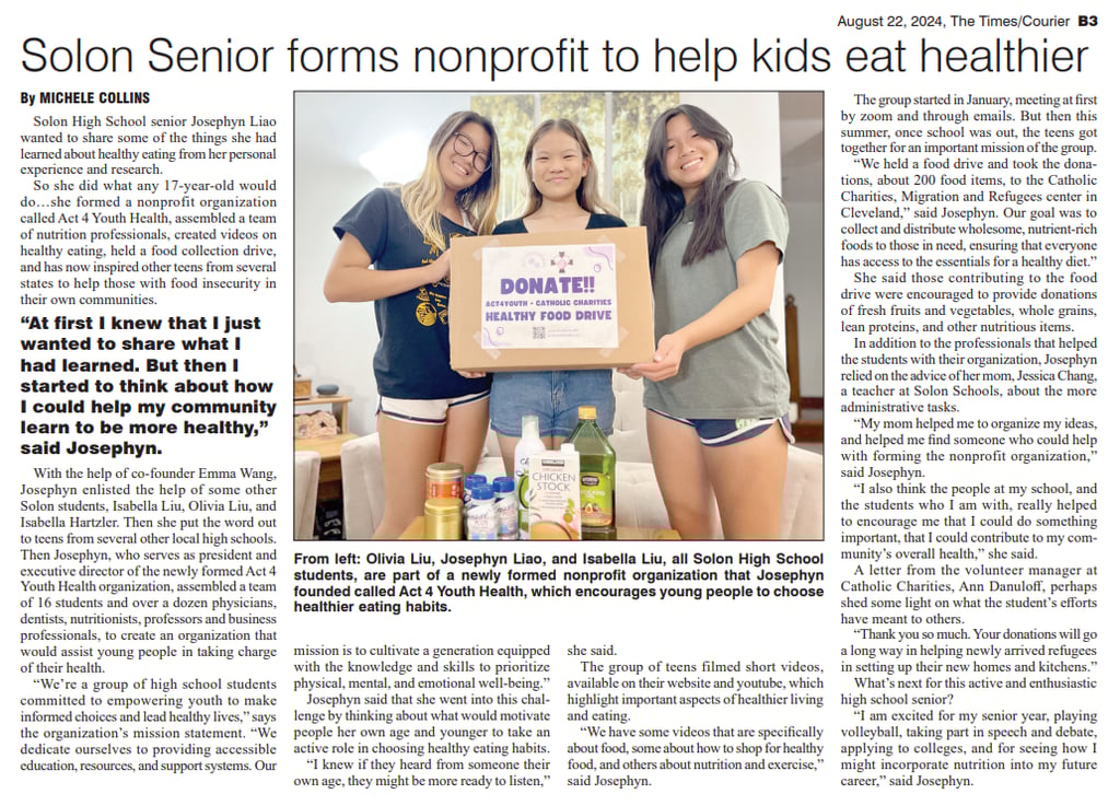 Josephyn Liao, founder of Actions for Youth Health, was recently spotlighted in a local news feature for her nonprofit’s efforts to promote healthier eating habits among children. Alongside her dedicated team, Josephyn works to educate and empower young people about nutrition, aiming to combat the growing issue of childhood obesity and related health concerns. The feature highlighted their community outreach, educational programs, and the positive impact they’ve had on improving youth health.