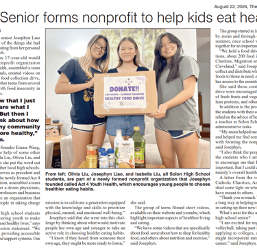 In recent years, children's nutrition has become a critical issue, with rising rates of childhood obesity and related health problems. Josephyn Liao, a resident of Solon, has taken an inspiring step forward in addressing these challenges by founding the non-profit organization, Actions for Youth Health. This initiative is dedicated to helping kids eat healthier and fostering a culture of wellness among the younger generation.